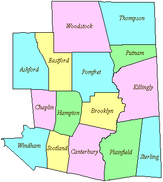 Woodstock, Thompson, Ashford, Eastford, Pomfret, Putnam, Killingly, Chaplin, Hampton, Brooklyn, Windham, Scotland, Canterbury, Plainfield, Sterling
